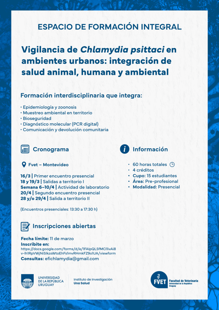 El EFI «Vigilancia de Chlamydia psittaci en ambientes urbanos: integración de salud animal, humana y ambiental», se dictará en la sede central de Facultad de Veterinaria de forma presencial.