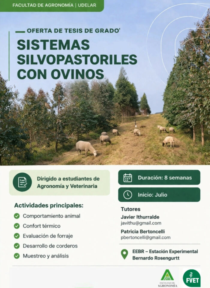 La oferta de tesis de grado «Sistemas silvopastoriles con ovinos» posee una duración de 8 semanas, iniciándose en julio. Se desarrollará en EEBR – Estación Experimental Bernardo Rosengurtt.