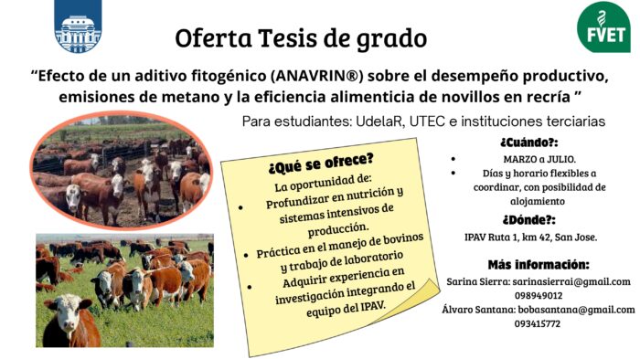 La oferta de tesis de grado se titula «“Efecto de un aditivo fitogénico (ANAVRIN®) sobre el desempeño productivo, emisiones de metano y la eficiencia alimenticia de novillos en recría». Los días y horarios serán flexibles (a coordinar), con posibilidad de alojamiento.