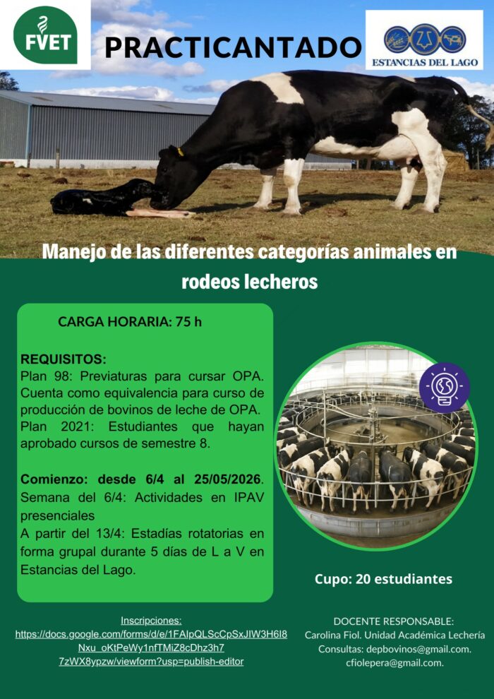 El practicantado «Manejo de las diferentes categorías animales en rodeos lecheros» realizará sus actividades presenciales en el IPAV durante la semana del 6 de abril. A partir del 13 de abril las estadías serán rotatorias y grupales durante cinco días de lunes a viernes en Estancias del Lago.