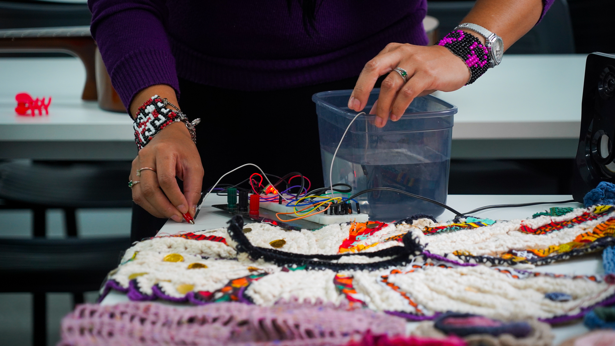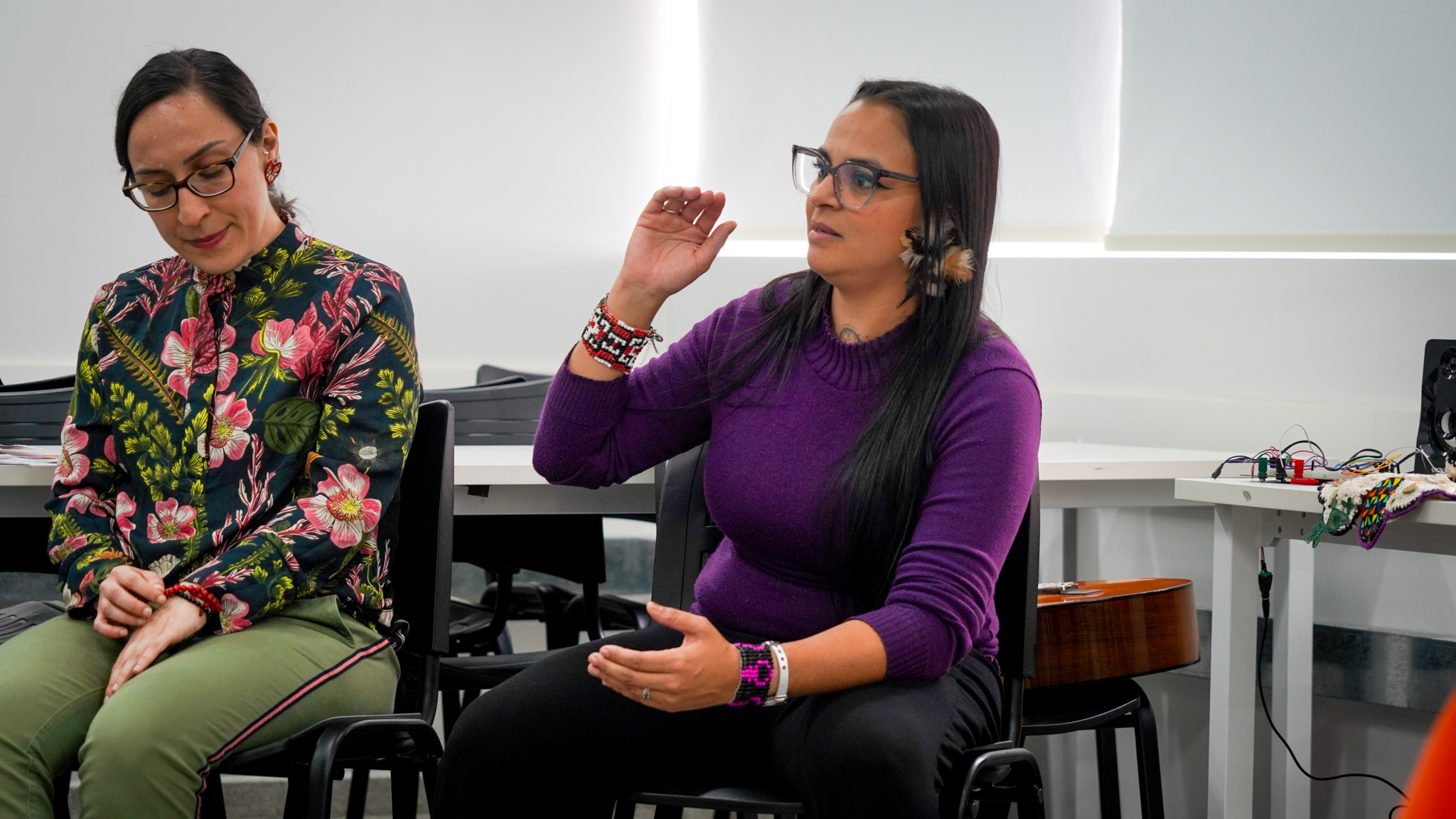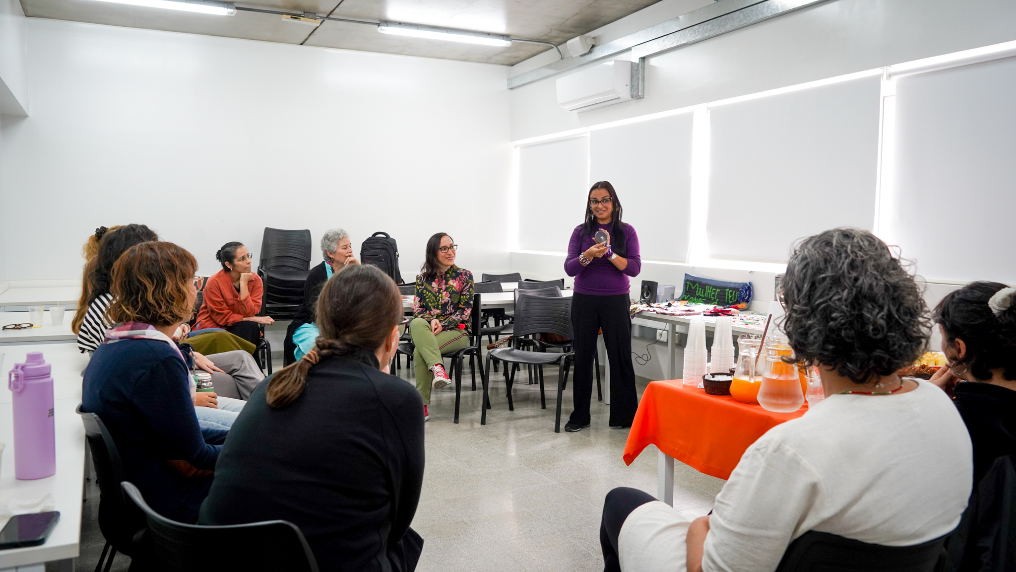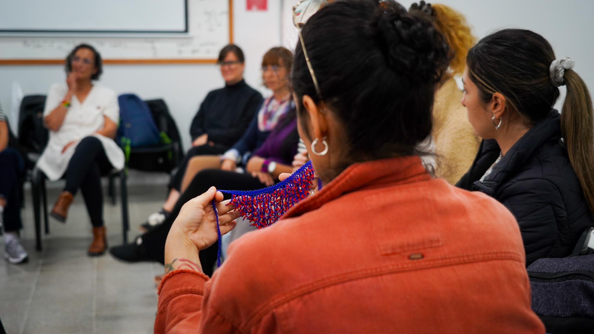 Lissette Torres Arévalo compartió sobre su proyecto de posdoctorado, que tiene como objetivo visibilizar a través de talleres de artesanía, las conexiones existentes entre memoria, creación, feminismos y cotidianidad. Explicó cómo funcionan las diversas actividades, que no se centran en sí en las técnicas artesanales como tal, sino en las diferentes posibilidades que estas permiten, incluyendo el abordaje de conversaciones entre mujeres, que surgen como un vínculo más íntimo, cuando se teje y borda en círculos. Ella es parte del Núcleo de Estudios Feministas y de Género, D’GENERUS, de la Universidad Federal de Pelotas, UFPel y su proyecto de post doctorado en Educación, titulado Epistemologías Feministas do Sul: entre fios e miçangas (Epistemologías Feministas del Sur: entre hilos y mostacillas), es financiado por el Consejo Nacional de Desarrollo Científico y Tecnológico, CNPq, de Brasil, a través del proceso 150526/2024-5.