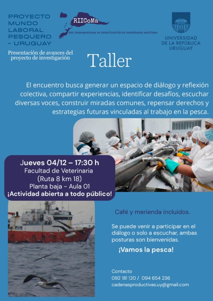 En el marco de las actividades del Proyecto Mundo Laboral Pesquero, se desarrolla el taller «Trabajo en la Industria Pesquera» a cargo de estudiantes de FCS, FCIEN, FCEA y FDER, en el cual se presentarán avances de los relevamientos en plantas pesqueras.